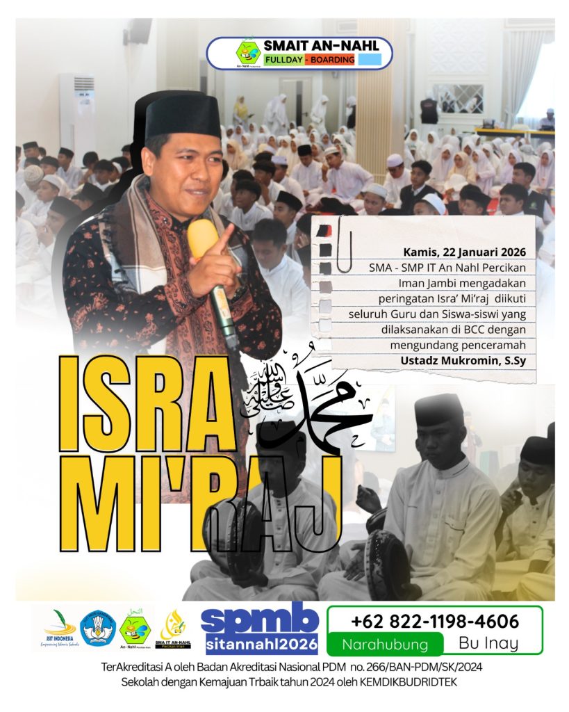 Acara ini dihadiri oleh orang tua murid (walimurid) dan dilaksanakan di Bee Convention Center (BCC) yang terletak di SIT An-Nahl Buluran. Kegiatan dimulai pada pukul 13.30 WIB hingga selesai, dengan menghadirkan KH. Misbahul Wathon, LC sebagai penceramah yang memberikan hikmah dari peristiwa Isra’ Mi’raj. Melalui acara ini, para peserta dapat mengambil pelajaran yang mendalam tentang perjalanan spiritual Nabi Muhammad SAW dan memperdalam pemahaman keagamaan. - Acara Isra’ Mi’raj di SMA-SMP IT An-Nahl – 22 Januari 2026