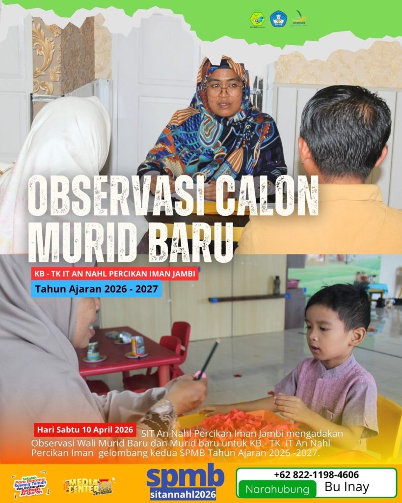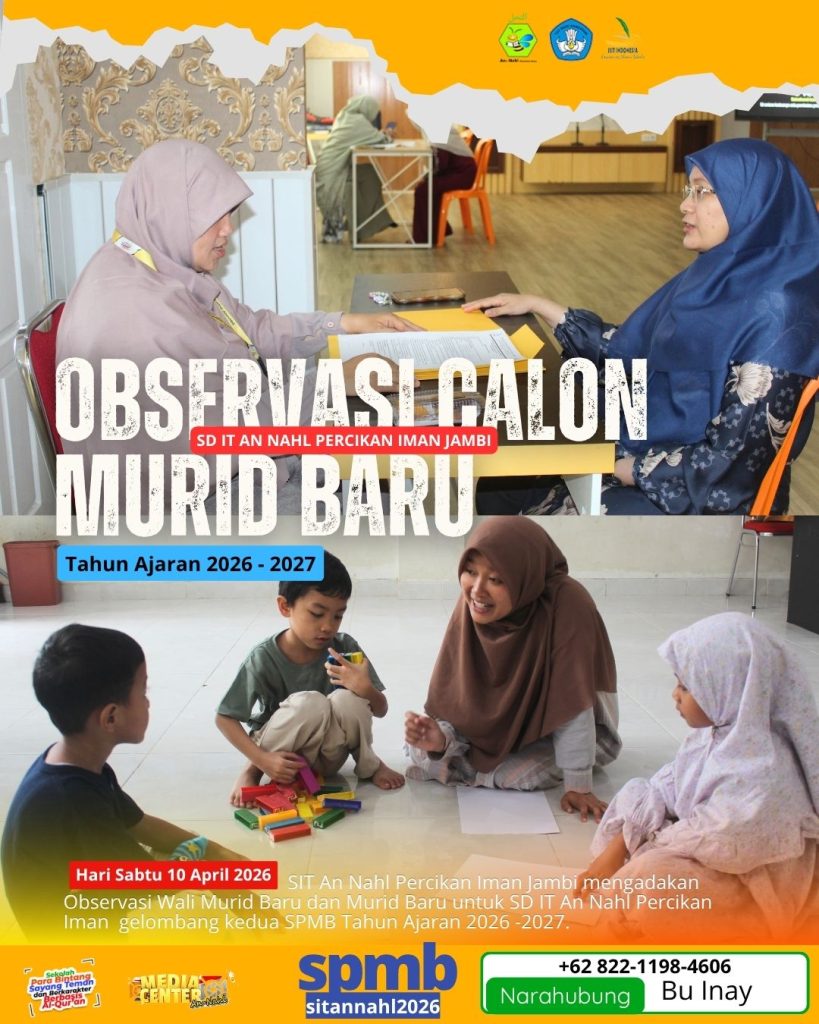 Jambi – SIT An-Nahl Jambi melaksanakan kegiatan observasi dan wawancara calon murid baru sebagai bagian dari rangkaian proses Seleksi Penerimaan Murid Baru (SPMB) Tahun Ajaran 2026–2027. Kegiatan ini diikuti oleh calon murid bersama orang tua/wali untuk mengenal lebih dekat kesiapan belajar serta karakter setiap anak.